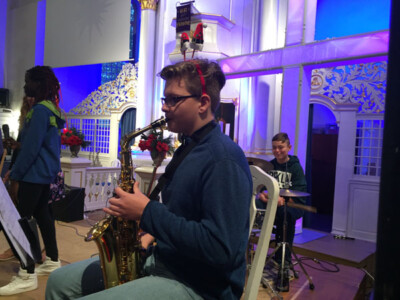 Die Rockband mit Schülern der Klassen 6-10 zeigte viel Einsatz am Mikro, Schlagzeug, Gitarre und am Saxofon.